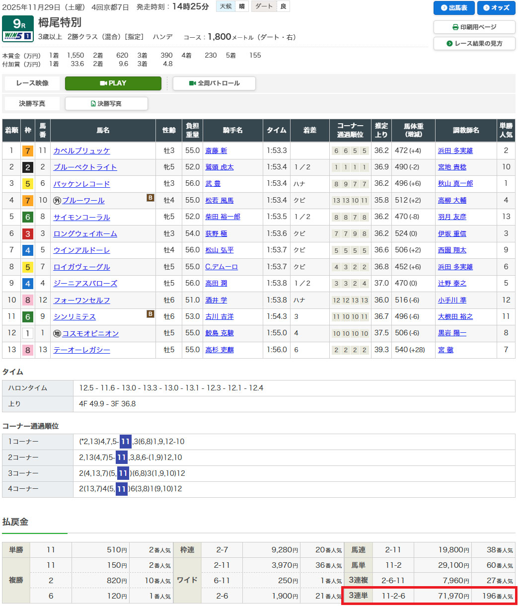 有料情報検証初日【11月29日(土)】公開されたレースは京都9Rでした。