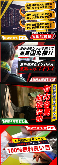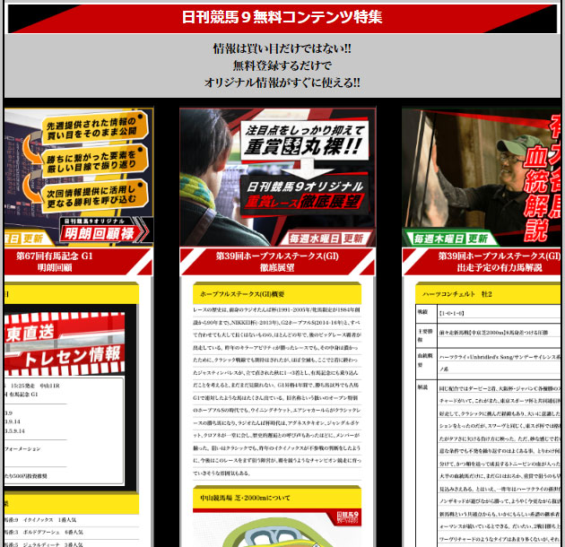 【日刊競馬9】は無料コンテンツで週末のレース展望や分析や血統解説だけでなく、重賞レース回顧なども会員登録をすることで見ることができます。