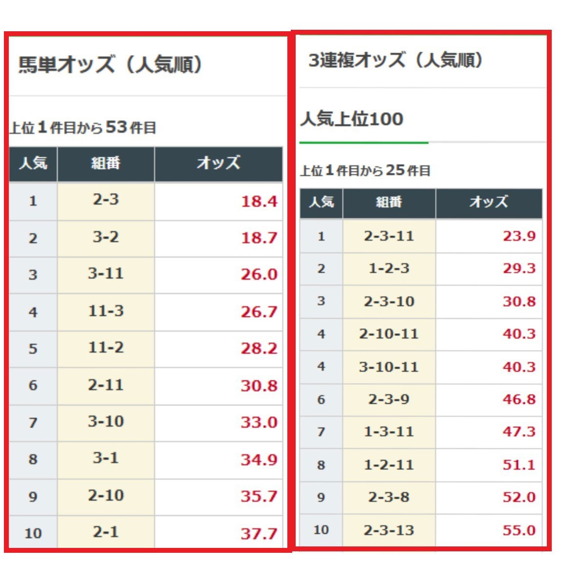 馬単も3連複のオッズはどちらも1番人気の買い目で10倍のオッズがつくので当たれば美味しいですね。