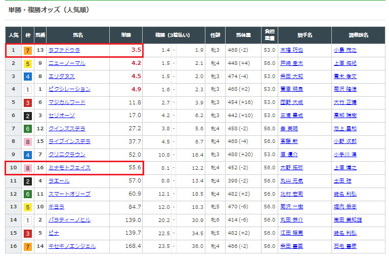 1番人気の⑬ラファドゥラが本命で相手は穴馬で10番人気の⑯ミナモトフェイスになります。
