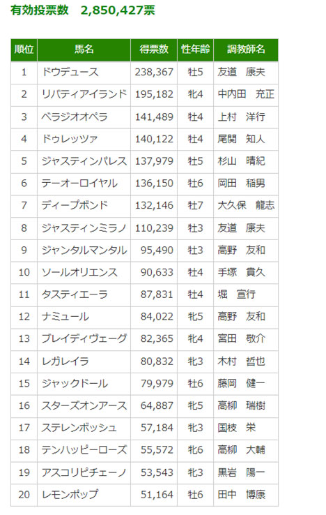 私はさっぱりでしファン投票も終わり、ドウデュースがダントツの1位になりましたね。
