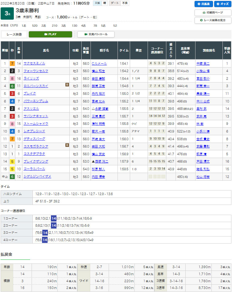 【検証レース①:3/20 中山3R 3歳未勝利】