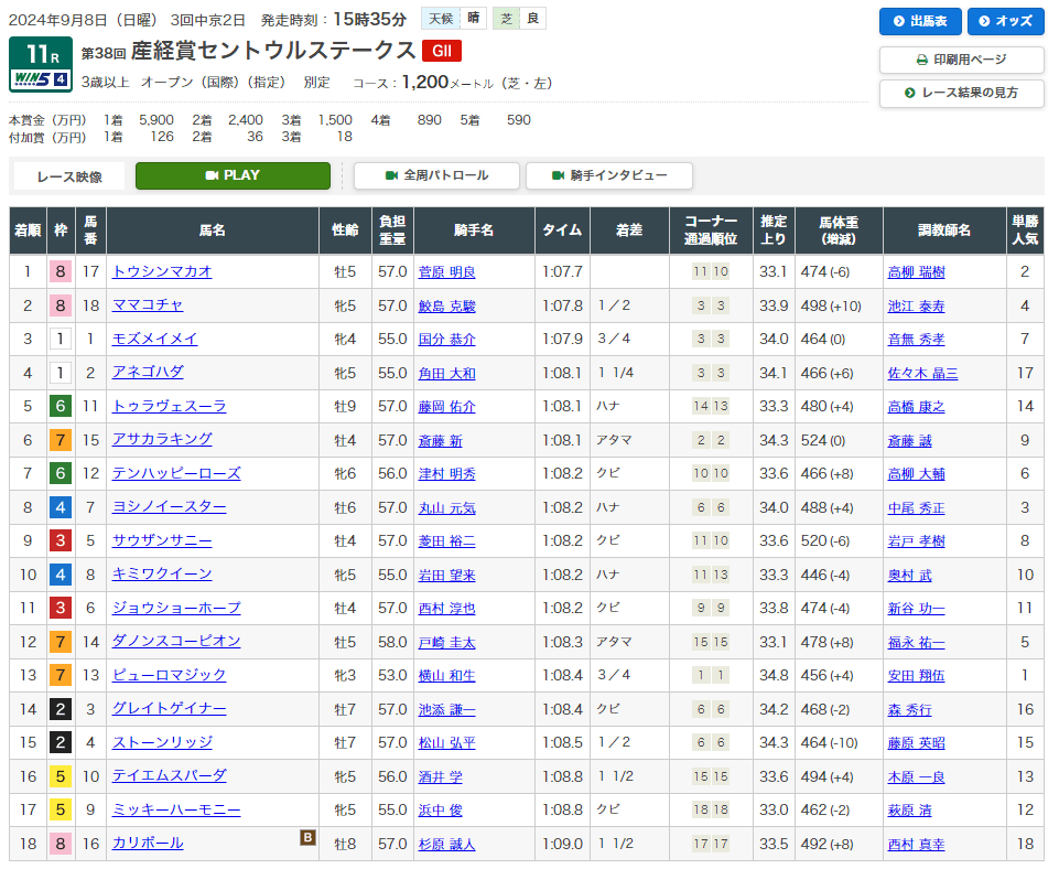 9月8日・中京11レース セントウルステークス(GⅢ) 3歳以上オープン 芝1200m