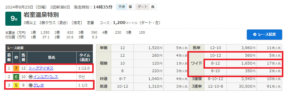 8-12で的中!!また美味しいオッズのワイドが的中しました!