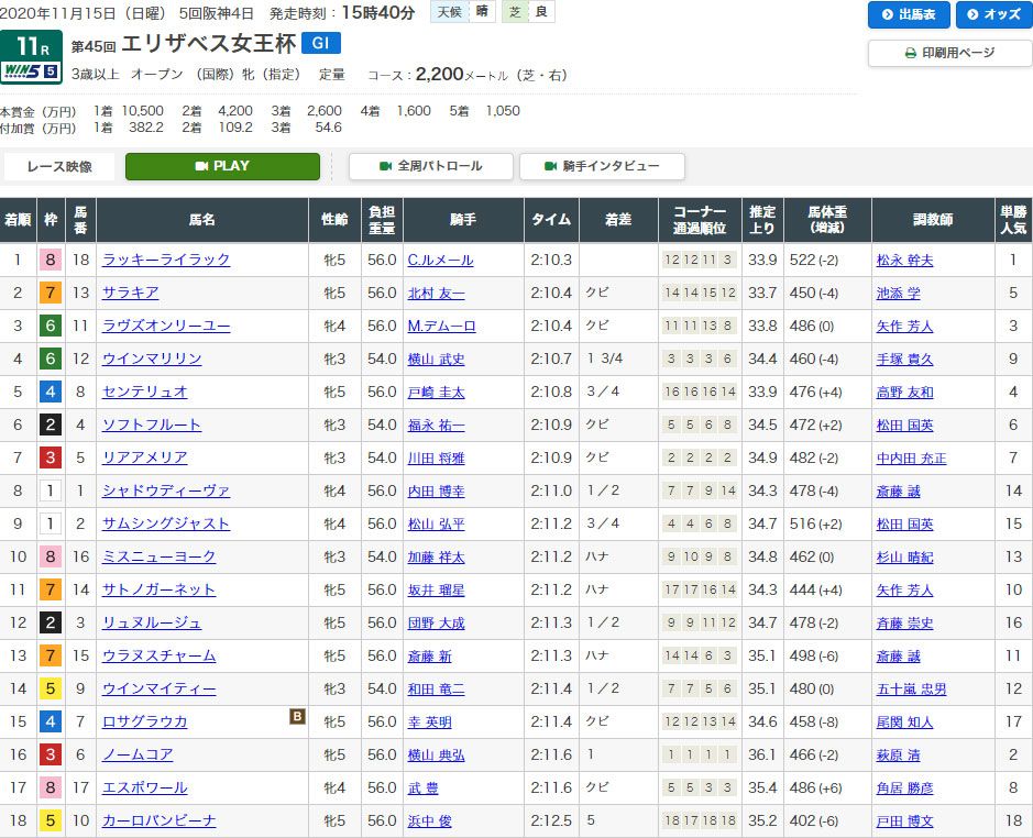結果は下記のように1着ラッキーライラック(1番人気)/2着サラキア(5番人気)/3着ラヴズオンリーユー(3番人気)と、例年通り堅い決着となりました。