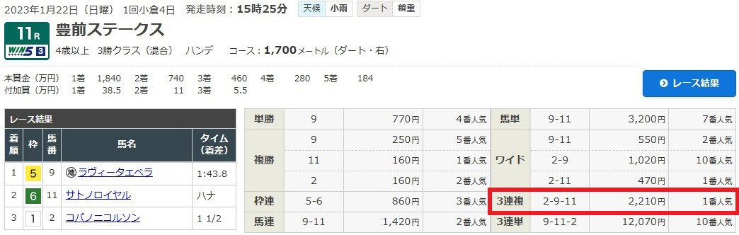 この日は中山と中京で重賞がありましたが、裏開催の小倉の10Rの予想でした。