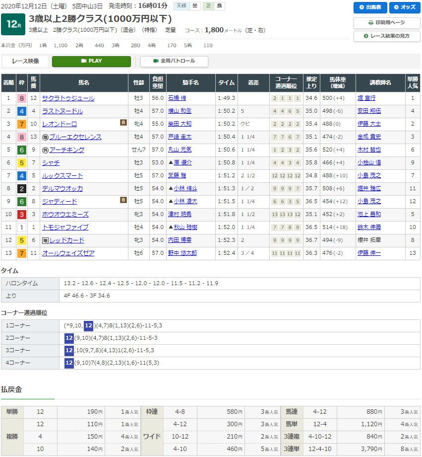 中山12Rで推奨されていた軸馬はバリバリの1番人気、単勝1倍台の1.9倍だったので900円勝ち…涙