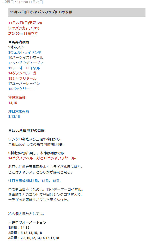 そしてジャパンカップ当日に無料予想が出ていたのでその買い目をご覧ください。