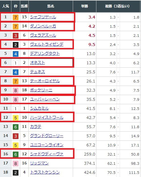 悲しいことに穴馬は馬券に絡まず、1着に買っていた⑭ダノンベルーガは馬券圏外、⑮シャフリヤールは2着で切っていた⑥ヴェラアズールが見事優勝しました。