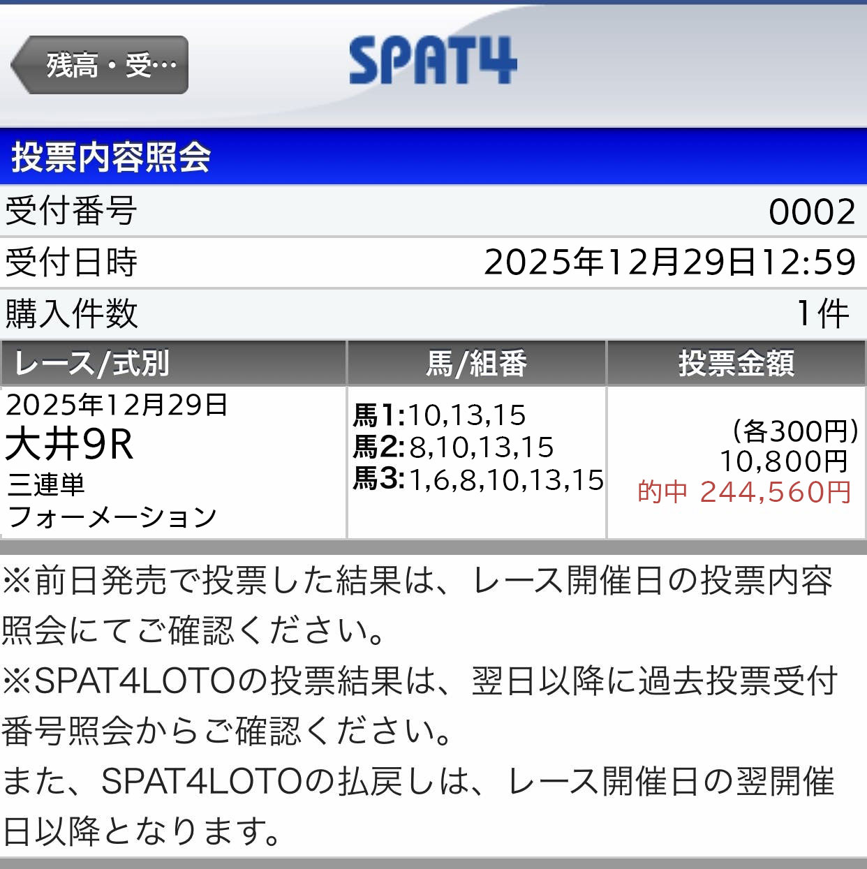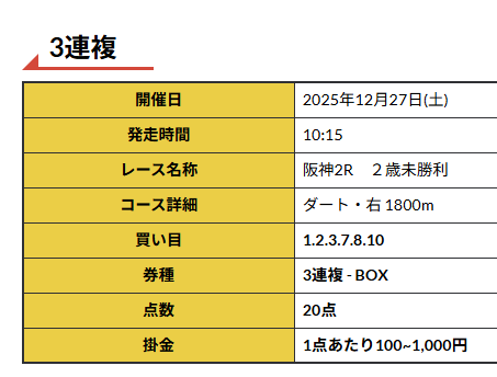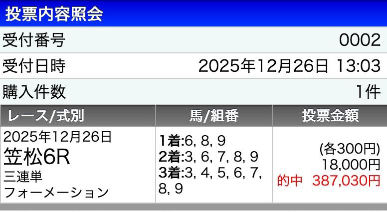 まさかの有馬記念前のレースで3連複41倍的中! 推奨通りに買って12万3千円もの配当ありがとうございました。 無事に有馬は自分の予想ではずしましたが、この的中があったおかげで2025年優秀の美を飾れました!