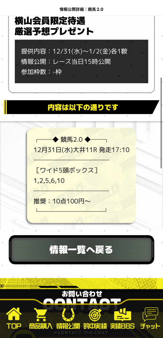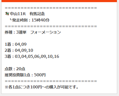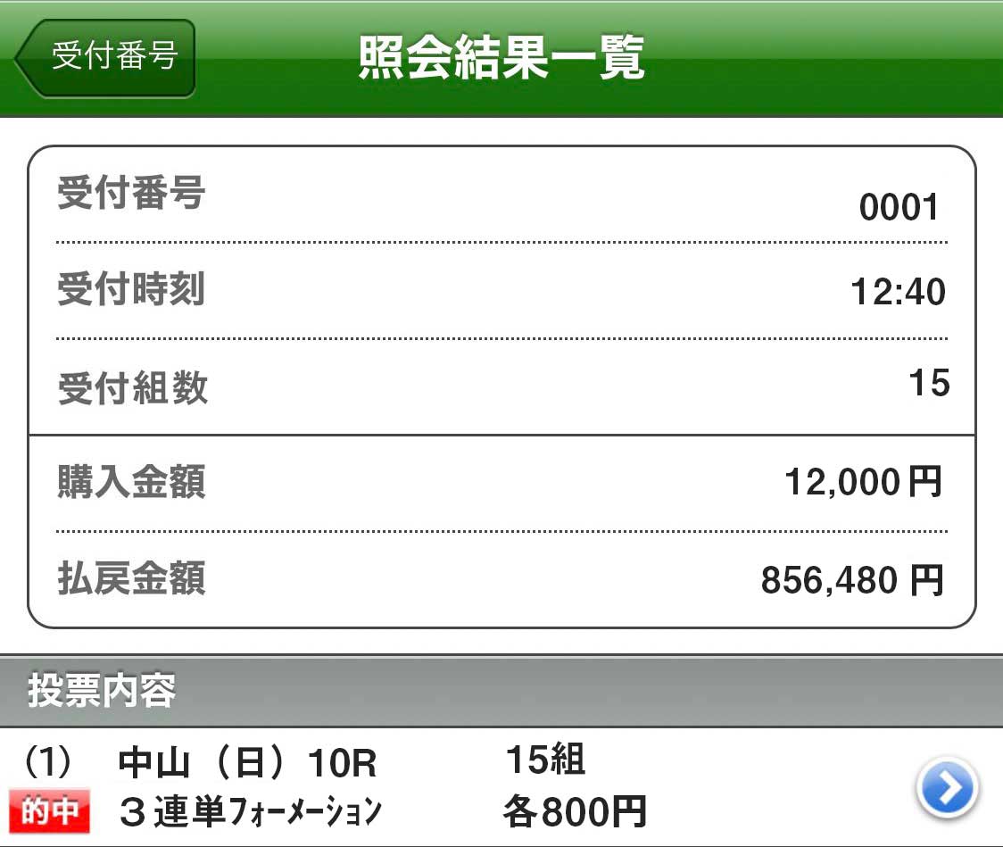 年末に最高の的中もらえました、しかも期間限定の無料情報。 よっぽどの自信の表れが配当でした。 1点100円~が推奨でしたけど点数も10点で少なかったから1点千円購入 年末最終日に15万200円ゲット、1/1の予想も当たってました。 2-6 1,930円 21人気 1-6 9,370円 51人気 1-2 3,720円 31人気