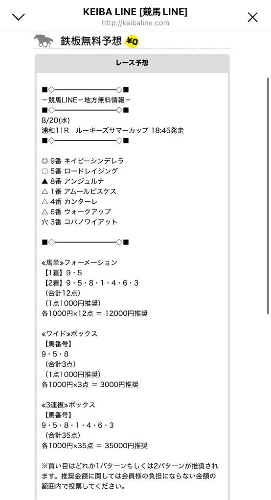 8/20(水)浦和11レースの無料情報で万馬券とれました!